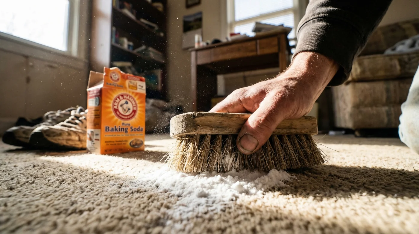 - Step 3: The Dry-Brush Magic. Take a dry, stiff-bristled scrub brush or a clean push broom and vigorously work the baking soda into the carpet. You want to push the powder past the surface fibers all the way down to the carpet pad where the worst odors live.